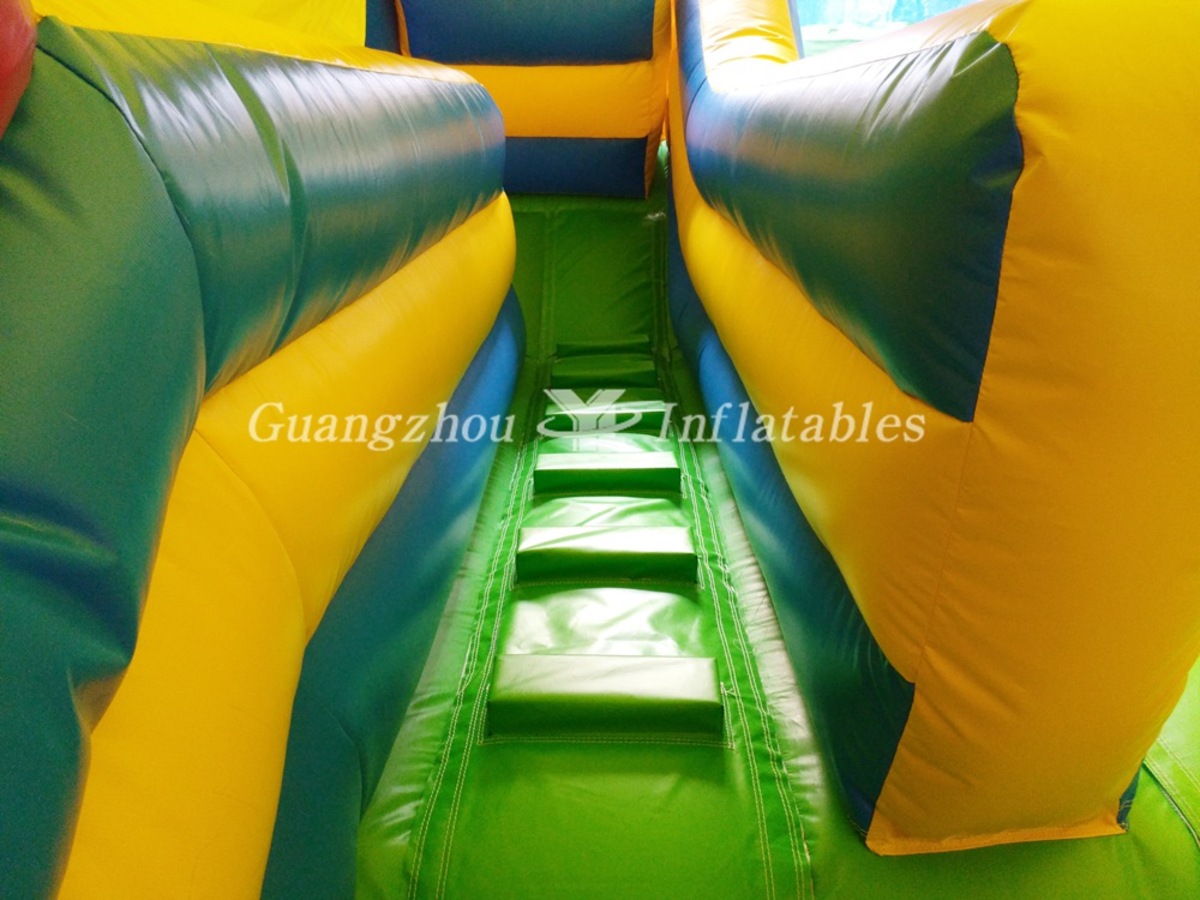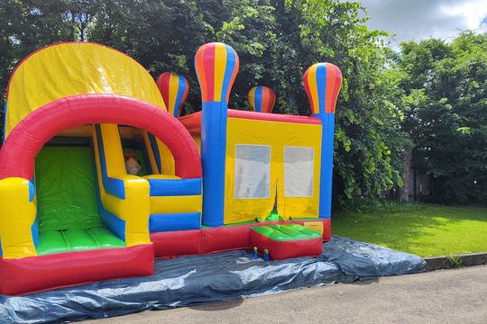 Nafukovací skákací hrad se skluzavkou a překážkami o rozměrech 6m x 5m x 4m. Ve sbaleném stavu je ve tvaru válce o rozměrech 150cm x 80cm. Jeho váha je 140 kg.